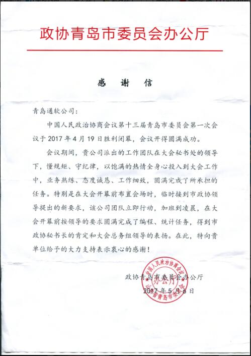 我公司順利完成青島市政協(xié)第十三屆一次會(huì )議委員會(huì )議保障工作2017-05-10