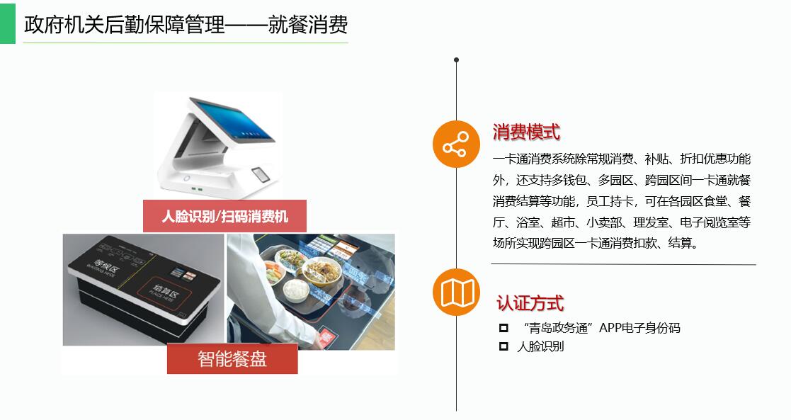打造智能化運營(yíng)體系,實(shí)現“互聯(lián)網(wǎng)+餐廳”的智慧餐廳管理新模式??刹捎每?、碼、臉任意一種方式扣款,滿(mǎn)足機關(guān)定額消費、補貼消費等多種消費需求;可增加移動(dòng)端功能應用,例如:自助充值、消費查詢(xún)、人臉采集、自助訂餐、自助掛失、訂餐評價(jià)、菜品早知道、通知公告、微商城等。